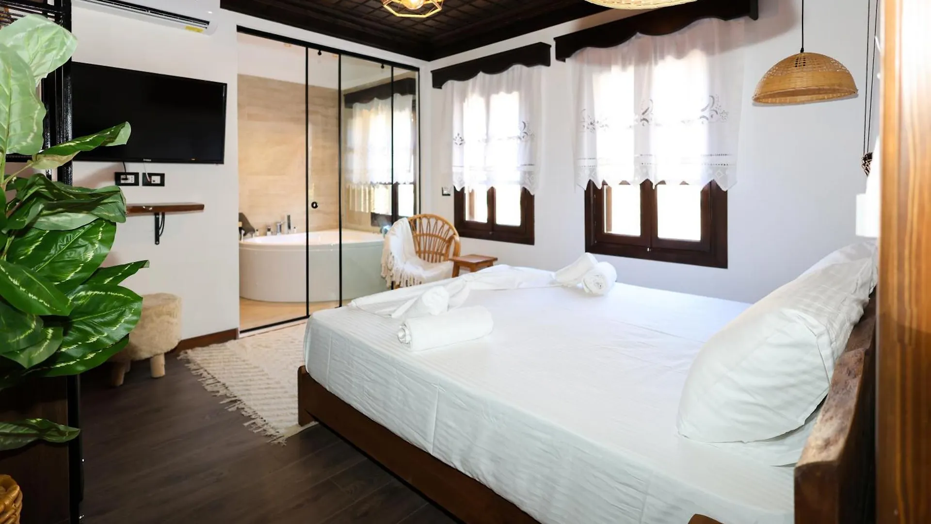 Einige Zimmer verfügen über einen Balkon und eine Küche mit einem Bügeleisen/Bügelbrett und einer Klimaanlage sowie einem Flachbildfernseher mit Satellitenkanälen. Neben einem Steinkamin gibt es hier auch einen Schreibtisch. Außerdem stehen den Gästen eine Wellness-Badewanne und eine getrennte Toilette sowie tolle Annehmlichkeiten wie ein Haartrockner und Morgenmäntel zur Verfügung. Von einigen Zimmern kann man einen Blick auf den Garten genießen.